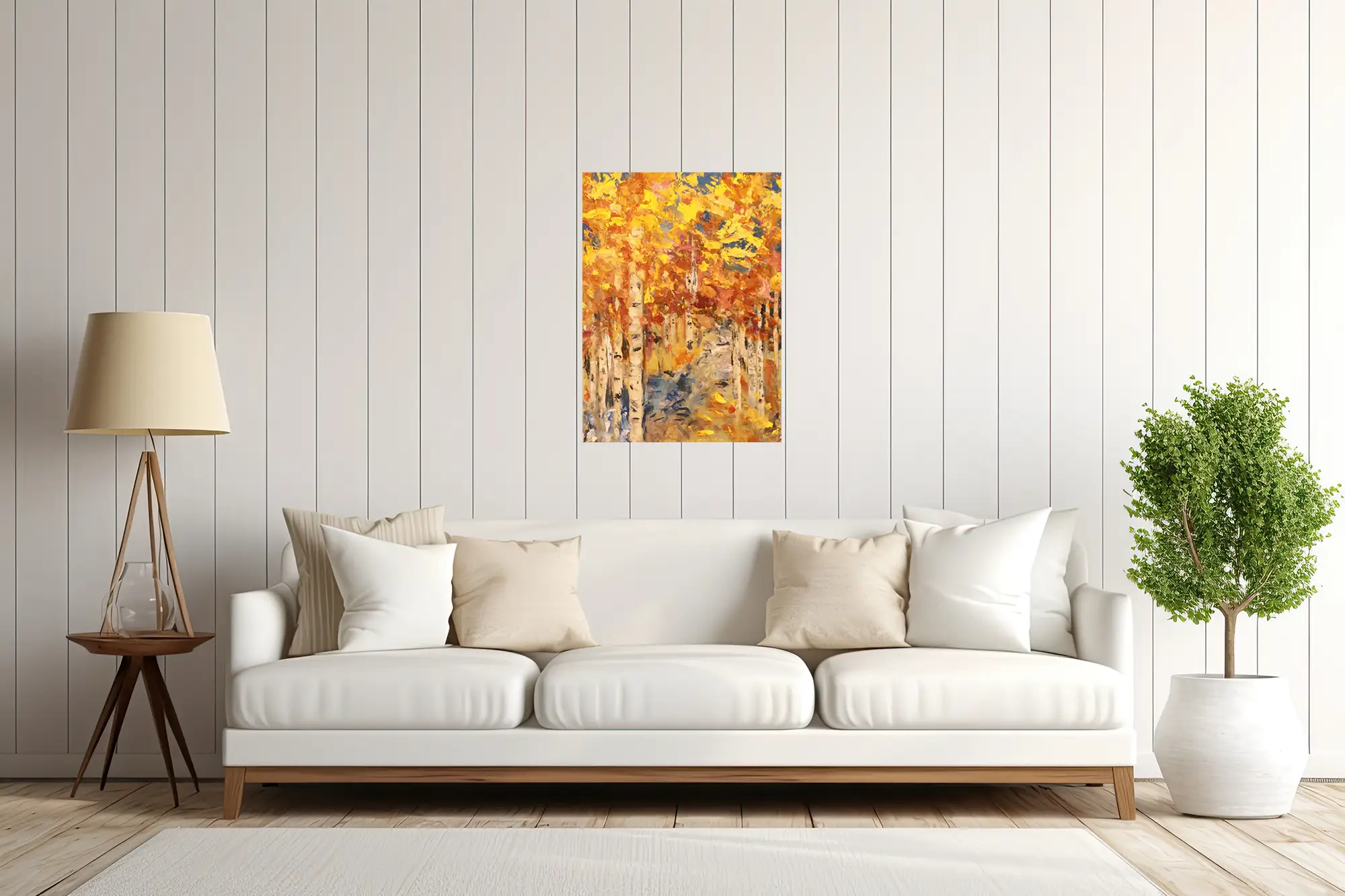 Falling Leaves oil painting by Michele Weitzenberg on wall over couch